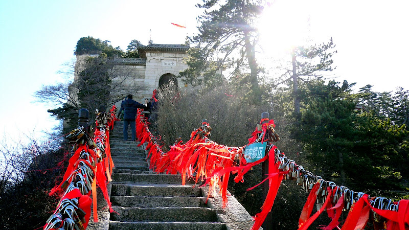 西安→玉泉院不下車,在東山門轉車到索道下站→從索道旁的山路開始爬山,約2.5~3小時爬到北峰→經蒼龍嶺、金鎖關後,就可接到東西南中四峰